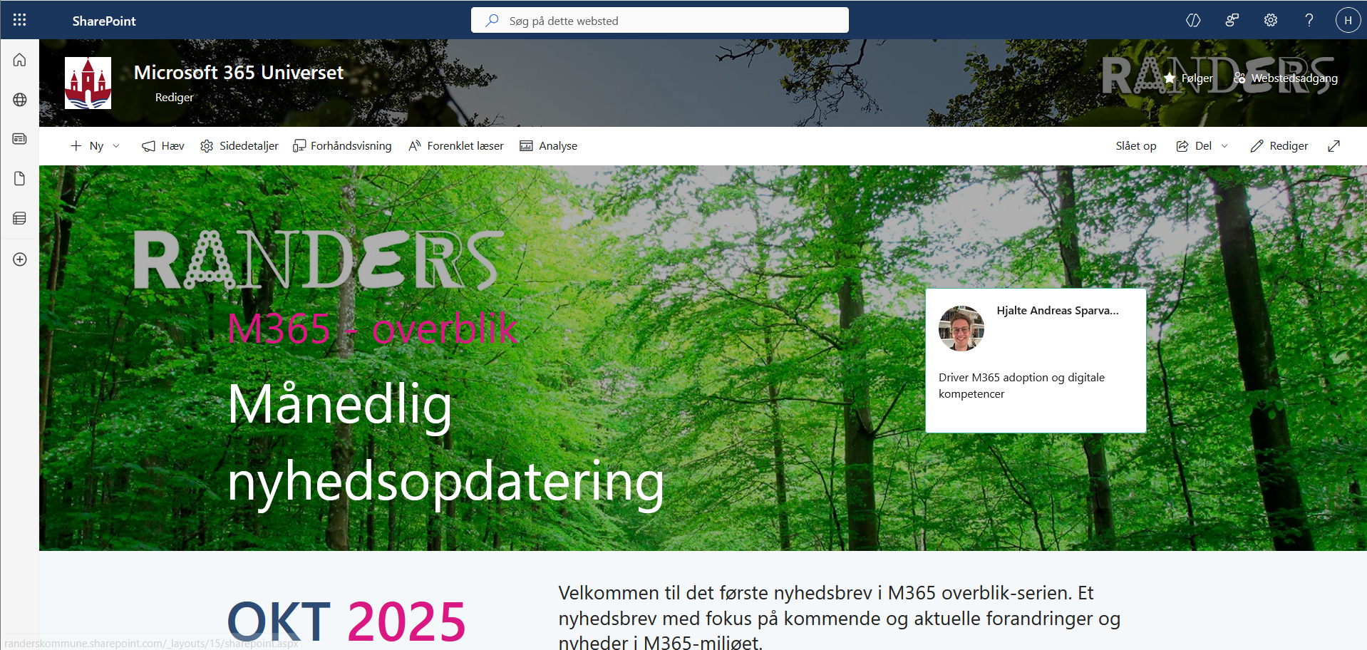 Nyheder, Guides, Podcasts & en direkte indgang til M365 hjælp kan findes på det nye M365 SharePoint